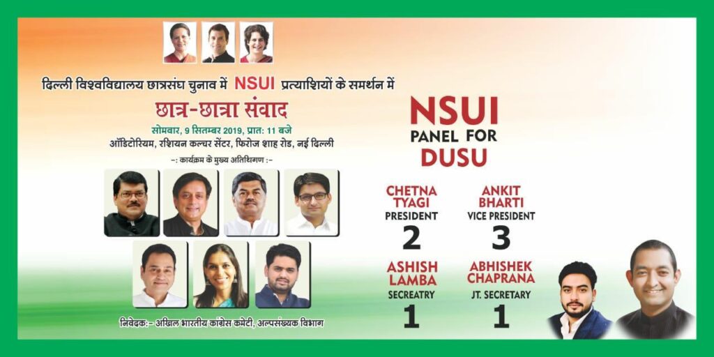 वर्तमान सरकार जाति धर्म साम्प्रदाय के नाम पर अपनी राजनीतिक रोटी सेंकने का प्रयास करने के साथ साथ देश संवैधानिक मुल्यों के साथ खिलवाड़ कर रही है, उन्होंने कहा कि कांग्रेस पार्टी के तिरंगे झंडे के नीचे हम विश्वविद्यालयों सहित देश भर में लड़ाई लड़ रहे हैं दिल्ली विश्वविद्यालय के छात्र संघ चुनाव में एनएसयुआई एतिहासिक जीत करने जा रही, उक्त कार्यक्रम में अतिथि के रूप में श्री शशि थरूर, श्री मुकुल वासनिक,श्री बी के हरिप्रसाद,श्री दिपेन्द्र हुड्डा, सहित कांग्रेस के कई दिग्गज नेता शिरकत करेंगे।