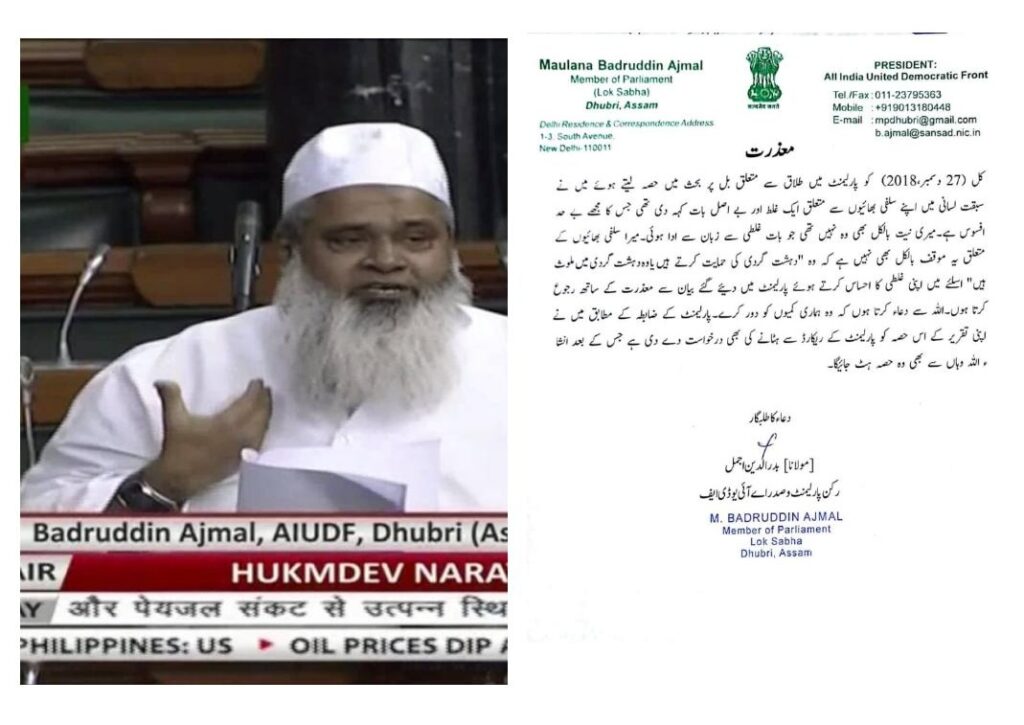 वजह रहेगी मौलाना बदरुद्दीन अजमल जैसे ही संसद में तलाक बिल पर बहस के लिए खड़े हुए उन्होंने अपने भाषण करने की बजाय भाजपा सांसद मीनाक्षी लेखी के किसी बात का जवाब देने लगे जिस पर चलती मतलब का टच कर आ गया और और उसकी वजह से मौलाना की जवान से दहशत गर्दी की बात निकल गई इसका मौलाना को तुरंत ही एहसास हुआ और संसद से बाहर निकलते हुए उन्होंने इस पूरे मामले पर सफाई दी देर रात इन के दफ्तर से लेटर हेड पर एक पत्र भी जारी किया गया जिसमें 9 बगैर किसी झिझक के अपने अपनी बातों को बताते हुए सेल्फी मसलक के लोगों से माफी मांग ली है