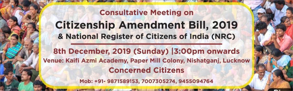 लखनऊ यूपी-आज लखनऊ के कैफ़ी एकेडमी निशातगंज में सिटीजनशिप अमेंडमेंट बिल, 2019 और एनआरसी पर एक मीटिंग का आयोजन किया जा रहा है जिसमें प्रदेश भर से जनसंगठनों, मिल्ली तंजीमे व दानिशवरो के साथ साथ समाजसेवी लोग तथा सामाजिक कार्यकर्ता हिस्सा लेंगे।