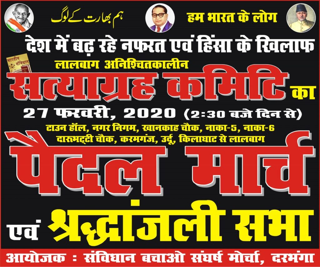 प्रेस विज्ञप्ति/26.02.2020,दरभंगा- दिल्ली में हो रहे फसादात धार्मिक दंगे नहीं बल्कि एक खास तबके को निशाना बनाकर उसको डराने की साज़िश है। जिस में गृह मंत्रालय और दिल्ली पुलिस पुरी तरह सहभागी लगती है। कई सामाजिक कार्यकर्ताओं को रासुका लगाके अंदर कर दिया जाता है, जो आवाज़ उठाता है उसे हर तरह से तंग किया जा रहा है। लेकिन हम दरभंगा और देश के अमन पसंद लोग सच को सच बोलते रहेंगे, कल दिनांक 27 फरवरी को इसी सिलसिले में दरभंगा लालबाग़ सत्याग्रह से दिन के 2:30 बजे एक बड़ा पैदल मार्च निकाला जाएगा जो लालबाग़ से टाउन हॉल, नगर निगम, खानकाह चौक, 5 नाका से दारुभट्टी होते हुए महराजगंज, करमगंज, उर्दू , किलाघाट होकर लालबाग़ आएगा वहां अब्दुल हमीद चौक पर दिल्ली में दंगे में शहीद हुए मासूमों को कैंडल जलाकर श्रद्धांजलि देंगे और इसके माध्यम से पूरे देश के संविधान प्रेमियों का हौंसला रखने, शांति और भाईचारा बनाये रखने की अपील करेंगे।