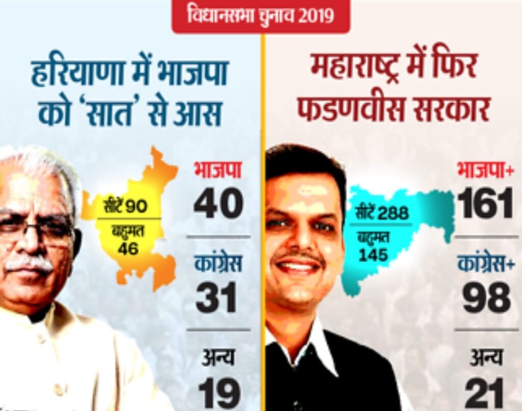 नई दिल्ली. दो राज्यों में हुए विधानसभा चुनाव में महाराष्ट्र में भाजपा और शिवसेना गठबंधन को स्पष्ट बहुमत मिला है।गठबंधन