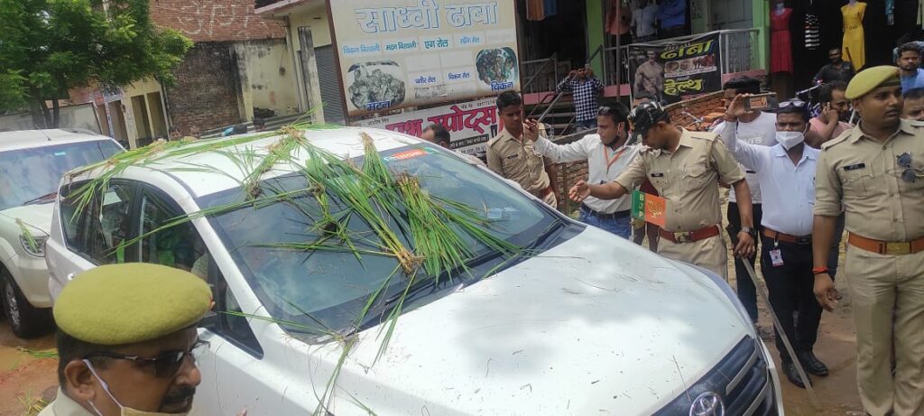 टूटी सड़क को लेकर सपाइयों का हल्ला बोल, घोसी विधायक के गाड़ी पर धान के पौधे फेंक किया प्रदर्शन
