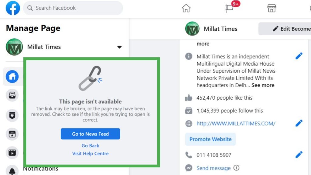 नई दिल्ली : (असरार अहमद ) फेसबुक ने बिना किसी आधिकारिक सूचना के मिल्लत टाइम्स का ऑफिशियल पेज सोमवार 13