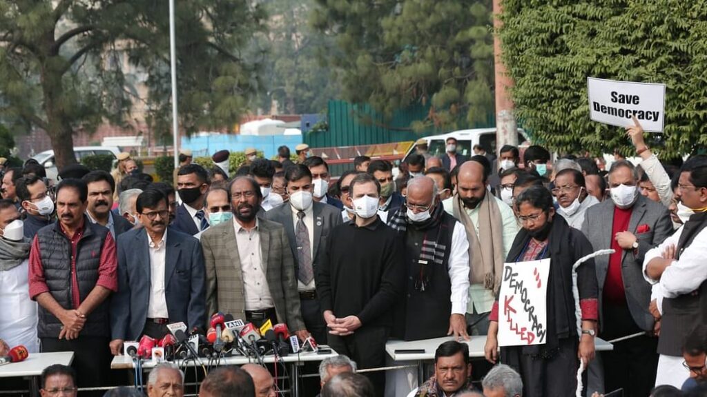 नई दिल्ली: कांग्रेस और कई विपक्षी दलों के सदस्यों ने मंगलवार को संसद भवन परिसर में राष्ट्रपिता गांधीजी की प्रतिमा